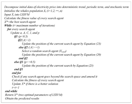 After obtaining the natural forms of the deterministic trend, periodic term, and stochastic impact effect of hourly electricity price, the LSSVM optimized by WOA is utilized to respectively predict these three items, and the electricity price data can be predicted via multiplying the forecasted data of those terms. Considering the data availability, when those three components are forecasted by WOA-LSSVM, the data at the last moment and the data at the same moment of yesterday are treated as the input data series. Taking the determinacy trend as an example, when future data of the determinacy trend is forecasted, the determinacy trend data at the last moment and at the same moment of yesterday are fed into the WOA-LSSVM model.