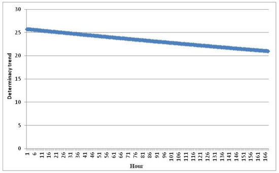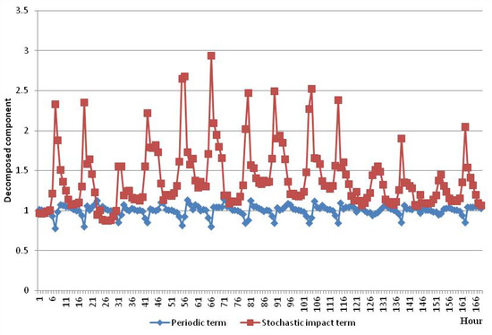 At the first stage, the B-N-D model is applied to decompose the logarithmic form of original 168 h electricity price data. Before disintegrating, considering the qualifications of the B-N-D approach, it is required to test whether the first order of the logarithmic form of original hourly electricity price data is stationary employing the ADF unit root examination method. As is shown in Table 1, the hourly electricity price data series are stationary at first order, and it can be known that the qualification of B-N-D is met whereby the data series can be co-integrated at first order. Therefore, we can disintegrate the logarithmic form of hourly power price data into the determinacy trend, cyclic item and random component through applying Equations (3), (8) and (9). Considering that the obtained three components are all in logarithmic form, we should convert them into natural form to be applied for the WOA-LSSVM method. The disintegrated results of those three components in natural form are shown in Figure 3 and Figure 4. The determinacy trend demonstrates the data series shows a decreasing tendency over the time changes. The stochastic impact effect illustrates the influences of unexpected and uncertainty stochastic factors on data series. The cyclic item implies the periodical change of electricity price data series.