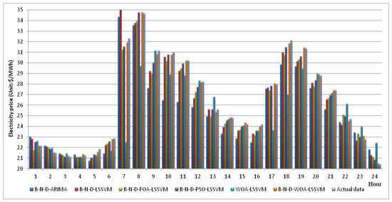 According to the principles of aforementioned models, the future 24 h electricity price data can be predicted. The parameters values of B-N-D-LSSVM, B-N-D-FOA-LSSVM, B-N-D-PSO-LSSVM, and WOA-LSSVM are illustrated in Table 4. The forecasting results of B-N-D-LSSVM, B-N-D-FOA-LSSVM, B-N-D-PSO-LSSVM, B-N-D-WOA-LSSVM, B-N-D-ARIMA and WOA-LSSVM are illustrated in Figure 5. It can clearly be seen that the gap between B-N-D-WOA-LSSVM and actual electricity price data is the smallest, followed by B-N-D-PSO-LSSVM. While the gap between WOA-LSSVM and actual electricity price data is the largest, followed by B-N-D-ARIMA.