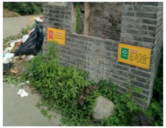 The key environmental risk is insufficient capacity for waste disposal, which is closely related to economic risk. After concentration, much more domestic waste would be accumulated, which needs collective disposal rather than individual disposal. Therefore, I Village does not consider it as a significant risk factor compared with other CRS villages. The capacity of waste disposal is determined by both the labors and physical facilities [,]. Usually, the physical facilities are sufficient. However, there is insufficient labor to collect domestic waste in houses or public places in the case villages. In addition, domestic waste sometimes was not transferred in a timely manner from the concentration site to the disposal factory, which results in environmental pollution or dispersion of viruses and bacteria, as shown in Figure 3. Measures should be taken to promote self-collection and drop-off in the fixed domestic garbage. In addition, the transfer of domestic waste from villages to the disposal factory should also be optimized to reduce long term accumulation of domestic waste in the fixed domestic garbage.