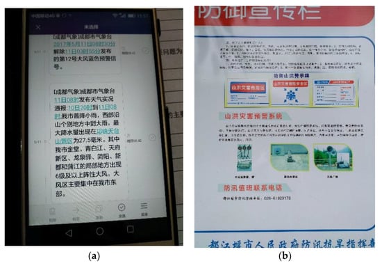 Materials and information of disaster relief in the case villages. (a) Information dissemination of hazard forecast through SMS; (b) poster of disaster relief education.