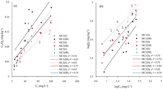 Adsorption procedures have been suggested for use in predicting the partition of P between solution and solid phases in the environment [28,42]. The relationship of P equilibrium concentration with the amount of adsorbed P was expressed as linear correlations (Figure 1). The P adsorption data of each sample could be described by the Langmuir (r2 > 0.65) and Freundlich (r2 > 0.70) isotherms. Among the moisture content and biochar amendment, MC1(SB) had the lowest Qe (176.73 mg·kg−1), followed by MC3(SB) (277.99 mg·kg−1), which was comparable to that of MC2(SB) (286.69 mg·kg−1) at an equilibrium P concentration of 6 mg·L−1. Meanwhile, the Qe of MC1(S) (221.78 mg·kg−1) was lower than that of MC2(S) (355.50 mg·kg−1) and MC3(S) (355.56 mg·kg−1) at equilibrium concentrations of 13, 8, and 4 mg·L−1, respectively. At >110 mg·L−1 equilibrium concentration, MC1(SB) (654.55 mg·kg−1) had the lowest Qe, followed by MC1(S) (738.55 mg·kg−1), which was comparable to that of MC3(SB) (799.43 mg·kg−1), MC2(SB) (827.12 mg·kg−1), MC2(S) (942.65 mg·kg−1), and MC3(S) (1009.78 mg·kg−1). Xu et al. [43] evaluated the effects of biochar amendment on P sorption and desorption in three soils with different acidities. The results showed lower P loading on the biochar-amended black soil, which might be due to differences in biochar production conditions and feedstock types [44].