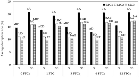 Average desorption ratio among moisture content, biochar amendment, and freeze–thaw cycles (FTCs). S and SB represent soil and biochar-amended soil, respectively. Different lowercase letters in the same FTCs indicate significant differences among different moisture contents within the same sample at p < 0.05. Different uppercase letters in the same moisture content indicate significant differences among different FTCs at p < 0.05.