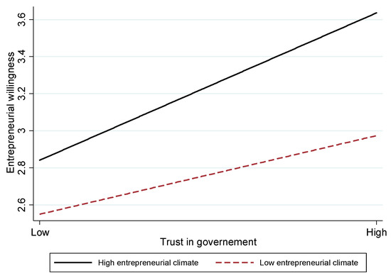 To test Hypothesis 3, we examined whether the entrepreneurial climate moderated the relationship between trust in the government and entrepreneurial willingness to return to one’s hometown. We first centralized the trust in government and entrepreneurial climate, and then constructed an interactive term by which trust in government multiplies entrepreneurial climate. According to moderating effect testing procedure recommended by Aiken and West (1991) [51], we entered trust in government, entrepreneurial climate, and the interactive term of the two variables into the regression equation simultaneously, and the regression results showed that entrepreneurial climate has a positive moderating effect on the relationship between trust in the government and entrepreneurial willingness to return to one’s hometown (, ). Furthermore, we plotted the interactive effect following the method recommended by Stone and Hollenbeck (1989) [52]. Figure 1 shows that the positive relationship between government trust and entrepreneurial willingness to return home is stronger when the migrant worker perceived the regional entrepreneurial climate as being stronger; hence Hypothesis 3 was supported.