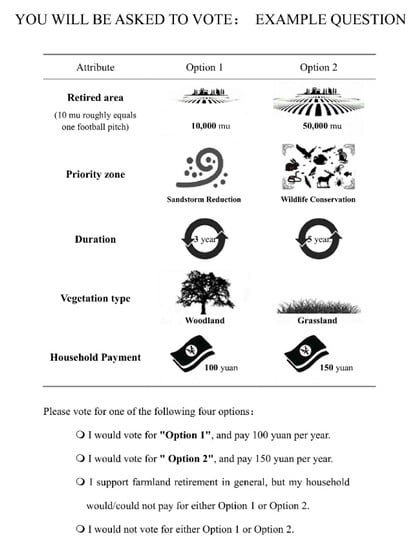 With reference to the standard procedure [35], our experimental design allowed respondents to choose their preferred one from the following four options: (1) Two hypothetical FRP designs to be implemented in Wuwei city, labeled as Option 1 and Option 2; (2) two opt out options, including “I support farmland retirement in general, but my household would/could not pay for either Option 1 or Option 2” and “I would not vote for either Option 1 or Option 2”. Based on our experience of previous CE surveys and a pre-survey in the study area, we found that some respondents believed it was right to vote for ecological restoration options because of the social pressure. However, they were not actually willing to pay the corresponding fees, which caused the payment percentage that we obtained to be more than the percentage that respondents would actually pay. To this end, our choice sets included two opt out options, and the “support but not willing to pay” option was used to avoid the appearance of “fake” payments [17]. During the model estimation process, the two opt out options have been merged. Figure 2 provides an example of the choice questions used in our questionnaire.