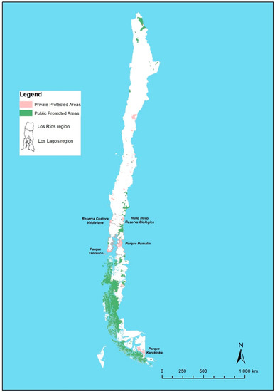 In Latin America, Chile plays a special role in private conservation. It is the only state with 2.2% of its territory under private protection, making it one of the nations with the highest proportion of private conservation areas. Only small countries such as Costa Rica and Belize have a bigger relative share of their territory under private conservation [12]. 19.2% of Chile’s territory is protected in the National Park System known as SNASPE (Sistema Nacional de Áreas Silvestres Protegidas del Estado) [12]. Furthermore, Chile has 308 Private Protected Areas, with an estimated area of 1,651,916 ha [13]. Figure 1 shows the distribution of public and private parks in Chile. In 2013, there were 308 private initiatives in Chile. There is an evident concentration of these undertakings in southern Chile, especially in the Los Ríos (72 areas) and Los Lagos regions (86 areas).