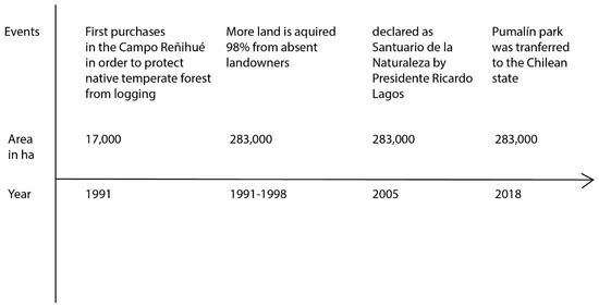 Chile specifically has adopted a very neoliberal approach to their national economy. With the beginning of the Pinochet regime in 1973, governmental institutions were diminished, and private property rights were strengthened [6], promoting foreign investments in the primary sector as well as land sales for conservation. Over the last three decades, this tendency was facilitated by three factors: (i) the retreat of governmental institutions and the increase of NGOs managing protected areas; (ii) the integration of conservation in market mechanisms as a characteristic of global neoliberal capitalism; and (iii) leading conservation NGOs have developed relationships with corporations copying their methods in areas such as marketing and receiving their donations [7]. Therefore, valuable land is increasingly integrated in market mechanisms. Land with a high conservation value is sold for ecotourism, or as payment for ecosystem services. Since the 1980s and mainly since the 2000s, NGOs have been cooperating with corporations and have allowed their activities to be viewed as positive [8,9,10]. However, in Chile, formal recognition of PPAs is inhibited by a lack of implemented regulations [11].
