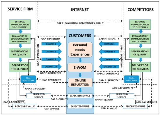 Today, online reputation is a key factor in companies. It takes place in the open environment of the Internet, where customers share their opinions about the goods, services, or brands acquired. The information transmitted through online channels and social media directly influences customers’ buying intentions, the company image that is transmitted, and customer expectations. It is in this context where the gap model of companies’ online reputation is formulated, in order to propose a tool that facilitates the identification of the main problems that companies have in managing their online reputations. The digital age is establishing intense communication activity where customers share their opinions and evaluations of the companies that compete in the market. Through these phenomena, online customer valuations are in some ways replacing the traditional model for measuring service quality. This online reputation has a direct impact on customer expectations and company revenues. Therefore, it is necessary to develop a new gap analysis model of online reputation that allows companies to transmit an image to their customers that is in line with the level of quality of service they are really offering. For this reason, the dynamics of online communication determine the formulation of competitive models through which companies evaluate themselves and their main competitors. All of this activity is focused on customers, who are at the core of the online reputation management model.