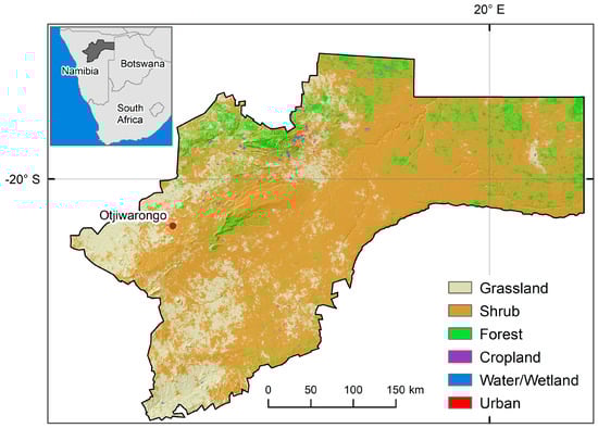 The sparsely populated Otjozondjupa Region with 1.4 inhabitant km−2 [18] is situated in Northeast Namibia (Figure 1), and it is one of seven LD hotspots in the country [19]. Otjozondjupa covers about 105,000 km2 and is characterized by grassland and sparsely-vegetated shrubland with small areas of closed canopy forest (Figure 1). The land tenure is predominantly private ownership except for community lands in northeast districts. Land use is mostly rangeland cattle farming, much of it being extensive commercial cattle farming, grain production, and a large proportion of smallholder subsistence agriculture, mainly in the communal lands [20]. Namibia is the most arid country in sub-Saharan Africa and prolonged droughts are well-known occurrences. These occurrences, as well as climate variability, are likely to increase in the future [21].