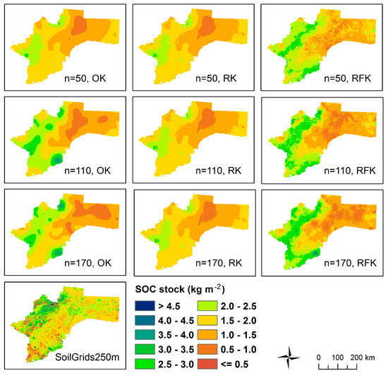 SOC stock maps of the Otjozondjupa region produced with different sample numbers and methods.