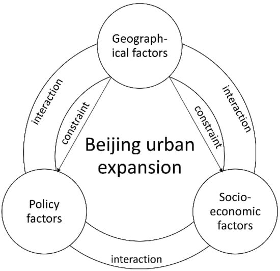 The driving forces of urban expansion in Beijing are complicated and diversiform. Through the research on the driving forces of urban space, three driving forces—socioeconomic, geographical environment, and policy guidance forces—are identified (Figure 2). The interaction among these three factors simultaneously affects urban expansion. Thirteen potential geographical, socioeconomic, and policy factors were selected in GeoDetector based on the literature review and the available data (Table 1). In China, a city master plan has proved to be a catalyst for urban growth. It features three guiding elements: land for new development, land for public facilities, and transportation [33]. Therefore, four factors are selected as proxies for urban planning: newly developed land, urban population density, distance to primary and middle schools, and distance to primary roads.