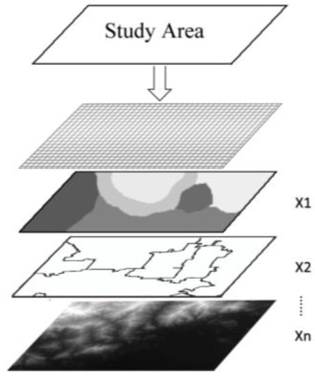 The interaction detector identifies the two factors’ interaction, for example, whether the interactions between two factors X1 and X2 will increase or decrease the explanatory force for dependent variable Y or whether the effect of these factors on Y is independent. First, we calculate the PD values of two factors X1 and X2, and then calculate the PD value when we overlay the two factors; thus, a new overlay of X1 ∩ X2 that combines the attributes of X1 and X2 is created (as shown in Figure 3). The overlaying factors can be implemented in ArcGIS 10.3. The interaction can be defined as follows: