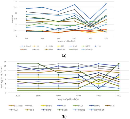 We analyzed the scale effects by testing the PD values and rankings of the 13 factors at 6 different sizes (Figure 4). The PD values showed fluctuation with increasing grid size. As the grid size changed, the rankings of different factors also changed. The factors were ranked in a relatively stable way when the grid was 4 km × 4 km and 4.5 km × 4.5 km. Relatively speaking, the grid which was 3 km, 3.5 km, and 5.5 km fluctuate greatly. Additionally, the PD values at 4.5 km × 4.5 km were relatively larger than the 4 km grid size. Thus, 4.5 km was selected as the optimal GeoDetector scale in this study.