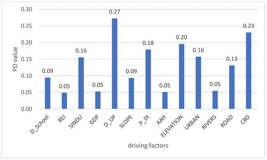 The PD value calculated by the factor detector represents the relative importance of the driving forces of urban expansion. As shown in Figure 6, the following factors are sorted according to their impact on urban expansion: D_UP > CBD > ELEVATION > P_DI > URBAN > SINDU > ROAD > D_School > SLOPE > RIVER > GDP > AAH > REI (see Table 1 for the specific explanations of these factors). The change in urban population density had the greatest influence at 0.27. To a certain extent, the urban population can reflect not only the size of the population that participated in industrial activities but also housing, transportation, and other needs in urban areas. Thus, the growth of urban population can directly affect the growth of urban land. The distance to the city center, which had a PD value of 0.23, also had a significant impact on urban growth. For undeveloped land, areas closer to the city center are more easily developed because of their economic, and human resources and facilities. Additionally, part of the reason for this significant effect is that when an area is closer to the city center, it is more influenced by urban planning.