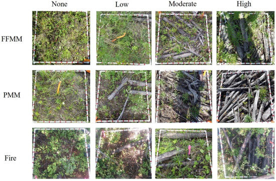 Visual representation of CWD levels in each soil type. The pictures are intended to highlight the CWD levels and not the plant community, which may not be representative of that treatment class. The quadrat frame in all pictures is 1 × 1 m. All photos by S. Das Gupta. FFMM = Forest floor − mineral mix, PMM = Peat − mineral mix. None is 0% CWD, Low is 1%–30% CWD, Moderate is 31%–70% CWD, and High is 71%–100% CWD.