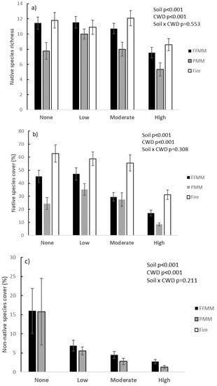 (a–c): Native species richness (a), native species cover (b), and non-native species cover (c) by soil type and CWD level. Values have a mean and standard error.