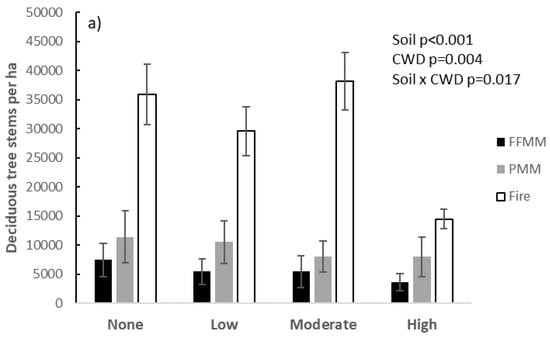 Coverage of bare ground was significantly greater (p < 0.001, data not shown) on PMM (average = 56% on No CWD plots) compared to FFMM and Fire plots (average = 20%). Among CWD levels, no CWD plots had significantly more bare ground than plots with CWD (p < 0.001) but with high CWD, all soil types had similar bare ground coverage of 5% (soil × CWD interaction p = 0.002).