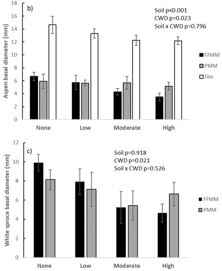 Average basal stem diameter of aspen trees was significantly greater on Fire than on reclaimed sites (Fire > PMM = FFMM, p < 0.001) while High CWD plots had significantly smaller aspen diameters than No CWD plots. All other CWD were similar (p = 0.023, Figure 3b). White spruce basal diameter on the reclaimed sites was similar between PMM and FFMM (average = 7.2 mm) and no CWD plots had significantly greater spruce basal diameter than both the moderate and high CWD plots (see Figure 3c).
