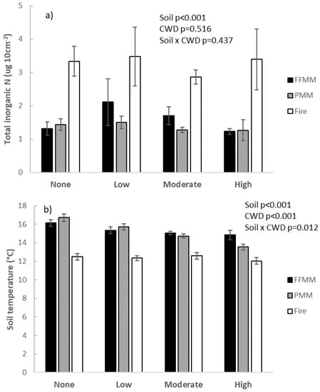 (a,b): soil total inorganic nitrogen (NO3− + NH4+) supply rate over a 55 day burial (a) and soil temperature averaged from three readings throughout the growing season (b) by soil type and CWD cover levels. Values have a mean and standard error.