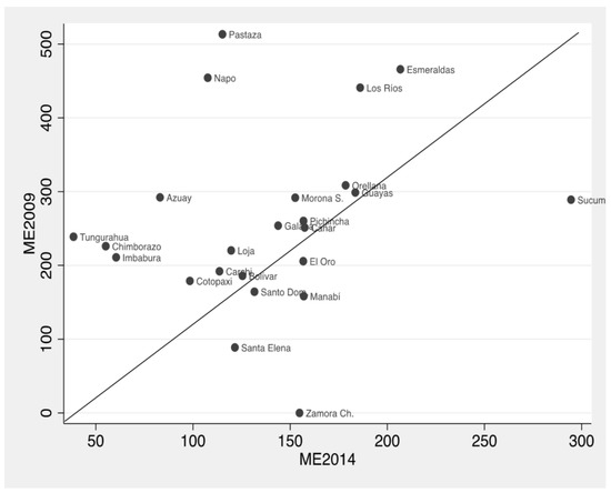 In the results of the first model of grouped ordinary least squares (OLS), the coefficients of the variables are very significant statistically, with a high R2 value, and coincide with the previous specifications approached in the study. In order to include a dimension that addresses space and time, a balanced panel regression was carried out. In this case, the same territorial unit (province) was studied for the years 2009 and 2014 as a whole, which allowed for the analysis of a greater quantity of data, with higher variability and greater efficiency.