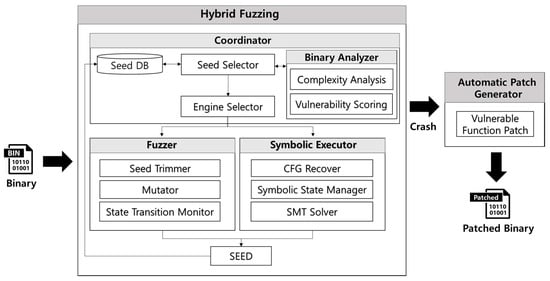 - Binary Analysis: A binary analysis module executes the target binary in an instrumentation environment. As a binary is executed, disassembly code and function call information are extracted through binary instrumentation. Binary complexity and vulnerability scores are analyzed using the extracted information. The results of the complexity analysis determine whether to run a fuzzer or symbolic executor to detect vulnerabilities. The results of the vulnerability score will be used to determine whether a detected crash is exploitable in future research.