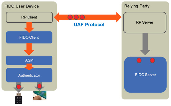 The FIDO (Fast IDentity Online) Alliance is a federation that provides a convenient and secure authentication system in the online environment and serves as a technical standard for authentication systems [1]. It was formed in 2013 by organizations including PayPal, Lenovo, and NokNok Labs for the purpose of industry standardization. In the same year, Google developed U2F (Universal Second Factor) authentication technology, a strong authentication technology for online services based on a security token, which was developed as a FIDO standard [2]. In December 2014, the Universal Authentication Framework (UAF), authentication technology that does not use passwords, and the U2F implementation standard were announced [3]. The FIDO Certified Testing Program, which tests and certifies interoperability between FIDO products, now has 382 (UAF: 288, U2F: 94) products worldwide which are classed as “FIDO certified” [4]. To address issues around the inefficient deployment and management of existing user authentication, FIDO UAF technology uses various authenticators in the mobile environment according to the security requirements of the Relying Party (RP). Figure 1 shows the FIDO structure [3]. The FIDO server and FIDO client send and receive messages through a server and client provided by the application service. The application server is called the RP server and the application service client is called the RP client. The request message sent by the FIDO server is delivered to the RP server, and finally reaches the FIDO client via the RP client through the network. The message format from the FIDO server to FIDO client uses UAF protocol. The FIDO client is called by the RP client according to the internal process communication protocol, which is called Intent in the case of the Android operating system, and the calling method is specified in the FIDO standard specification. The way in which the FIDO client communicates with the Authenticator Specific Module (ASM) is similar and uses a separate message specification as described in the standard. The FIDO authenticator is usually implemented as either hardware or software.