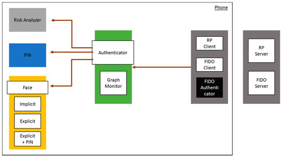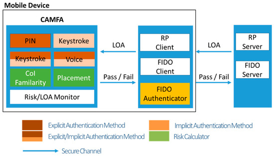 Figure 3 shows the implementation block diagram of CAMFA. The entities related to the FIDO standard, such as FIDO server, RP server, RP client, and FIDO client, are the same as the existing ones. However, the RP’s LOA is additionally specified in the parameter available as an extension in the FIDO protocol. As a FIDO authenticator, CAMFA receives an authentication request from the FIDO client; it then satisfies the RP’s LOA using the available implicit/explicit authentication methods. CAMFA also continuously monitors the LOA of the user’s current session based on the risk of the mobile device.