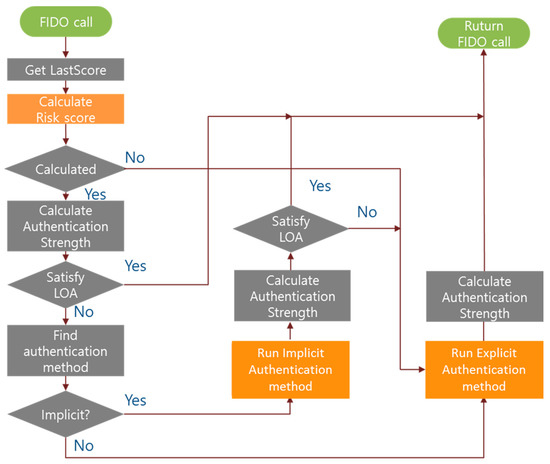 There are three points when CAMFA sends a request to the authentication methods. Firstly, CAMFA requests user authentication periodically. Implicit authentication methods require their procedures to collect and analyze sensor data in order to perform user authentication. For example, in the case of facial recognition authentication, time is required to initiate the camera and acquire an image of the user’s partial face. Therefore, it is advantageous if the user authentication is performed periodically within the valid period for the method, since the authentication method can then be utilized immediately when CAMFA receives a RP’s LOA request. Secondly, CAMFA requests user authentication when a user begins to use the mobile device. A change in the LOA occurs because an explicit authentication is performed at the moment when the user unlocks the device. At this point, it is possible for CAMFA to update the LOA of the user’s session by requesting the history of authentication methods, implicit authentications, and the risk of the current situation. Thirdly, CAMFA requests user authentication when the FIDO client sends an authentication request. If the LOA of the user’s current session does not satisfy the RP’s LOA, CAMFA performs the available implicit/explicit authentication methods that have enough entropy to meet the LOA required by the RP.