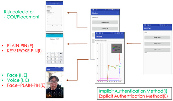 In the current version of the implementation, to calculate the risk score, we evaluate the concept of COI by learning the Wi-Fi fingerprint pattern to measure how familiar the user is with their current location [17]. Also, by analyzing the status information of the mobile device, the risk is calculated according to whether the user is in possession of their mobile device (e.g., is it in their hand, pocket, or on the table). For the PIN-type authentication method, CAMFA provides a PLAIN-PIN for authenticating the user according to whether the numeric string submitted by the user matches the registered numeric string and a KEYSTROKE-PIN for matching the user’s keystroke pattern. As an explicit/implicit biometric authentication device, a facial recognition module is included to acquire an image of the user with the front camera of a mobile device. It matches the acquired face image with a registered model of the user’s face.