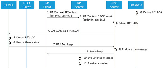 For interoperability with FIDO products, CAMFA was developed in compliance with the FIDO standard. In particular, in order to apply the LOA concept used in CAMFA to the FIDO standard, we extended the functions of the RP client, RP server, and FIDO server. Figure 6 shows the operational flow of CAMFA under the FIDO standard. The FIDO server predefines the RP’s LOA for each service identified by the policyID (Step 0). The RP client generates a “UAFContext.RPContext” message specifying the policyID of a service, then passes a “UAFContext.FIDOContext” message to the FIDO server via the RP server (Steps 1–2). The FIDO server extracts the RP’s LOA corresponding to the policyID (Step 3) and generates a “UAF AuthReq” message specifying the RP’s LOA. When the FIDO client forwards the message to CAMFA (Step 4), which is one of the FIDO authenticators, CAMFA parses the “UAF AuthReq” (Step 5) and executes an authentication procedure to satisfy the RP’s LOA (Step 6). The authentication result is included in the “UAF AuthResp” message and delivered to the FIDO server (Step 7). Next, the FIDO server generates the “ServerResp” message (Step 8) and passes the message to the RP server through the RP client (Step 9). Finally, the RP server parses the “ServerResp” message and determines whether to provide the service (Steps 10–11).