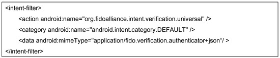 In order for the FIDO client to invoke CAMFA, we define the activity implicit intent of CAMFA as shown in Figure 7. The authentication request message encoded in JSON (JavaScript Object Notation) is named ‘application/fido.verification.authenticator+json’.