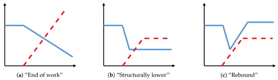 From the multisectoral perspective, we know that there are two mechanism required for sustained high levels of employment: (i) labor mobility within and across sectors and possibly upskilling of labor; and (ii) creation of new products, services, etc., ultimately culminating in new sectors requiring new skills. As such, there effectively is a race between technological development with demand for particular skills and education providing people with those necessary skills (cf. [43]). With regard to the outcome of this race, we discern three scenarios (see Figure 2).