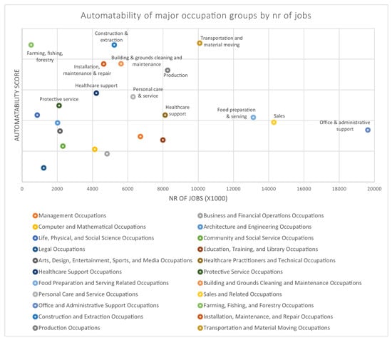 For a socially and economically sustainable growth path, the labor displacement in the sectors of application must be counterbalanced by job creation within the same and other sectors. Following our approach described in Section 3.3, we construct a comprehensive data set and compute automatability scores for major occupation groups as in formula in Equation (3). As the actual values of the automatability rely on the activity automatability score values, the absolute values have no particular meaning and are not reported. However, the relative values of course indicate relative automatability. Arguably, not only the automatability, but also the absolute number of jobs determine the actual probability that particular occupations face automation. As such, we plot the automatability against the number of jobs in Figure 3.