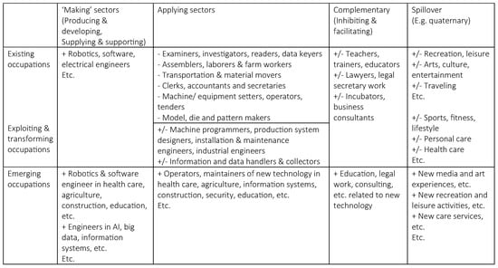 Arguably, the labor economic process described above is driven by entrepreneurial behavior in a process of creative destruction (cf. [35]) and brings about structural change; central in the literature on structural change is the shift of demand for labor in one to other sectors (e.g., [36,37,38]). Innovation and entrepreneurial activities give rise to new products and services, which in turn may give rise to new sectors in which jobs are created. As such, over time, the sectoral composition of an economy becomes more varied and output differentiation increases (cf. [20,21,22]). Here, we propose a multisectoral perspective akin to the structural change literature as a template to study the effects of automation. We discern two dimensions: (i) the type of sector affected directly or indirectly by automation (notably: (1) sectors in which the technology is applied; (2) producing, developing, supplying and supporting (“making” sectors); (3) complementary sectors (e.g., facilitating or inhibiting exploitation of the focal technology); and (4) quaternary sectors receiving spillover); and (ii) characteristics of occupations subject to technological change (notably whether these occupations face substitution, transform to reap complementarities, or come into existence creating and reaping new technological opportunities). With the introduction of these additional dimensions, we enable providing an overview of which specific sectors and occupations are actually affected and allow further disentanglement of displacement and countervailing effects of automation.