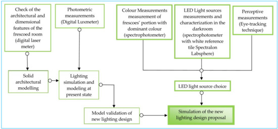 At present, important, essential changes affect lighting, both in the research, management, and production sectors; for example, solid-state lighting system diffusion (Light Emitting Diode, LED) allowed significant energy savings and considerable advances for lighting design, but at the same time a number of issues are still the subject of debate: that is, the evaluation of disability and discomfort glare in indoor environments, as well as control of light flickering and the colour rendering index (CRI). The extensive use of LEDs led to the development and application of automatic lighting control and regulation systems. They allow light flux and spectral composition of the emitted radiation at a fixed colour temperature of the light source to be changed, providing important support for lighting designs aiming at quality, visual comfort, the health and safety of people, and energy and economic saving. However, recently, all lighting standards and guidelines (for example, CEN standards [1]; Italian National Standards [2], French International Commission on Illumination or CIE [3,4]), are undergoing continuous modifications and revisions mainly due to international research and technological, as well as industrial development, even if they are differently oriented. There is a significant body of research dealing with the selection of good lighting sources and directions [5,6,7,8]. To assess choices for lighting quality for computer graphics most approaches have relied on user judgment related to the light direction [7,8,9]. Some recent studies concern the assessment of the visual appreciation of light sources and LED in a museum environment: colour appearance and quality have been studied under different light sources and LED lighting settings [6,7,8].