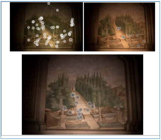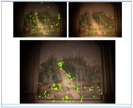 Referring to the experimental measurements obtained by the eye-tracking technique application explained above, the corresponding information content was gathered. The entropy (information) obtained by lighting the Villa Castello fresco with the three different LED-COB sources was as follows: the information value for the LED STD was 1750, for LED VWP it was 1727, and for LED VWh it was 1911. This result confirmed that the LED VWh source characterized by a spectral emission of light in strong compliance with surface colour (that is, the spectral emission of the surface), can also provide a relevant transmission of information content of the images, or in other words, a lower entropy production, that is, the effectiveness of the (luminous) signal for gathering information and the transduction of the signal in visual stimulus.