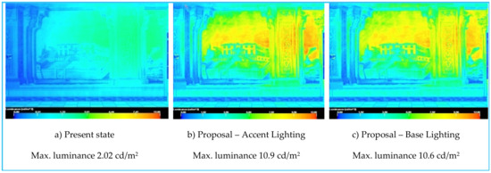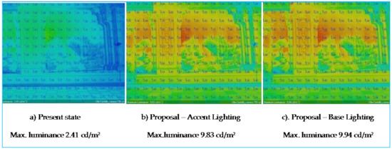 Through the post-processing of simulation results, the maximum, medium, and minimum illuminance values and the mean luminance value were calculated. The mean luminance value evaluated on the walls and lowered vault at 0.5 m height from the floor, is uniform. These results are provided in Table 6 with the comparison with the present state.