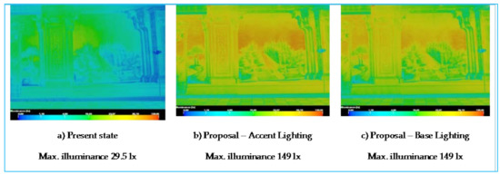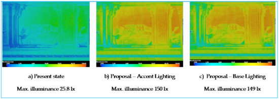 Simulation results of the new lighting proposal show uniformity and quality of light both for accent and base lighting. With reference to the Italian Standard on the technical-scientific criteria and rules of museum operation and development [32], lighting uniformity was evaluated: the suggested illumination and luminance ratios satisfy both the conservation requirements and fruition. The maximum illuminance limit value of 150 lx imposed by standards for frescos and works of art, made of organic material medium-sensitive to light, was respected.