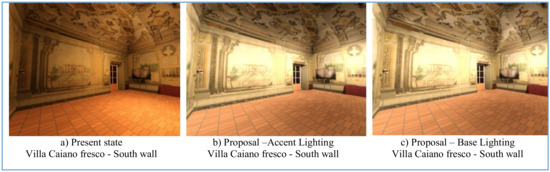 Figure 10 and Figure 11 provided the renders obtained respectively for Villa Castello and Villa Caiano frescoes at the present state in comparison with the new lighting design integrated solutions of accent and base lighting.