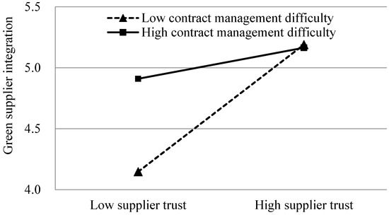 In H4, we predict that the link between supplier trust and green supplier integration will be strengthened when the level of contract management difficulty is higher. Model 7 in Table 4 indicates that the interaction between supplier trust and contract management difficulty is negatively related to green supplier integration (β = −0.167, p < 0.05). Thus, H4 is rejected. To better understand the moderating effect of contract management difficulty, we follow [53] and decompose the interaction term. Specifically, we perform simple slope tests and depict the significant moderating effect in Figure 2. We split the variable of contract management difficulty into two groups—low (one standard deviation below the mean) and high (one standard deviation above the mean)—and assess the impact of supplier trust on green supplier integration for both levels. As shown in Figure 2, the impact of supplier trust on green supplier integration is lower at high level of contract management difficulty compared with low level of contract management difficulty. These results further indicate that contract management difficulty negatively moderates the relationship between supplier trust and green supplier integration.