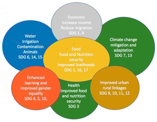 While not always explicitly considered in rural-urban linkages, peri-urban agriculture is also important and, along with other production in the rural-urban continuum, can enhance household food security, especially in times of crisis [45]. Rural-urban linkages viewed through a food lens help planners and policy-makers consider more interconnected development, as food production is linked to multiple resources including water quality, soil health, and other biotic functions across the region, as well as other food systems dimensions such as transportation distances and waste [37,46]. There are also challenges related to rural influences on urban agriculture, in particular, animal husbandry, odors, the presence of animals in urban contexts, and related planning contexts and ordinances. Also of note in the US context but relevant elsewhere are three key gaps identified as the need for a regulatory typology for planners outlining all potential situations, a more comprehensive analysis of multi-scaled barriers and enabling factors for urban agriculture, and evidence of the sustainability benefits of urban agriculture [47]. If properly leveraged, urban-rural linkages and new governance mechanisms offer multiple dividends as they, “… allow citizens and farmers to govern their food according to their own values and principles. Without such governance structures that interconnect and strike the right balance between key rural and urban actors, improved rural-urban linkages would not be possible” [37] (p. 8). While these connections are important, especially in putting rural on a more even footing with urban considerations, they do not always explicitly consider sustainability, particularly, food access, equity, and livelihood issues.