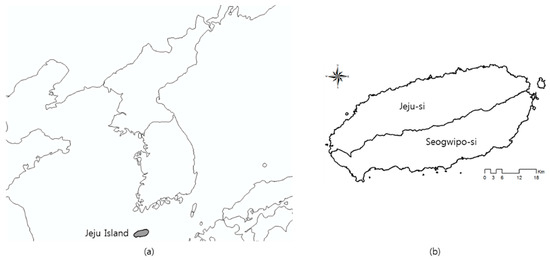 (a) The location of South Korea relative to Jeju Island and (b) a map of Jeju Island.