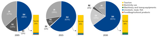 The total emergy and import composition of Jeju Island in 2005, 2015, and 2030. The total emergy is categorized as renewable energy (RE), indigenous renewable energy (IR), nonrenewable source use from within system (NR), imports (IM), and exports (EX). However, NR is excluded from the figure since the proportion was 0.11% (2005), 0.07% (2015), and 0.02% (2030), which is less than 1%. The bar graph shows the composition of IM which accounts for the largest portion of the total emergy. Fuels, plastics and synthetic rubber, chemicals, and finished products items are eliminated considering the proportion of IM.