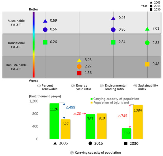 The environmental carrying capacity for the sustainable development of Jeju Island was evaluated based on the estimated emergy indices, including the percent renewable (%Renew), emergy yield ratio (EYR), environmental loading ratio (ELR), sustainability index (SI), and carrying capacity of the population (CCP). These indices are supposed to be compared across indicators. The results of the indices were grouped into three types of systems and divided into sustainable system, transitional system, and unsustainable system [32].