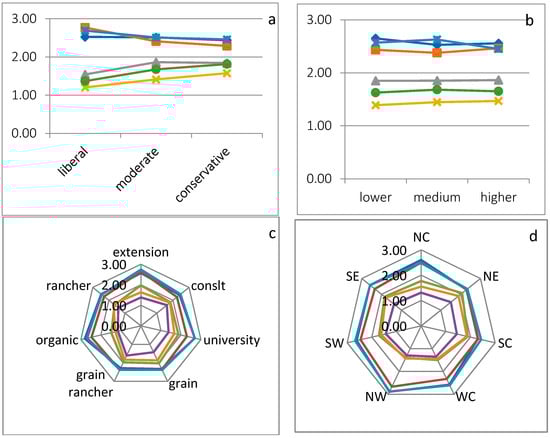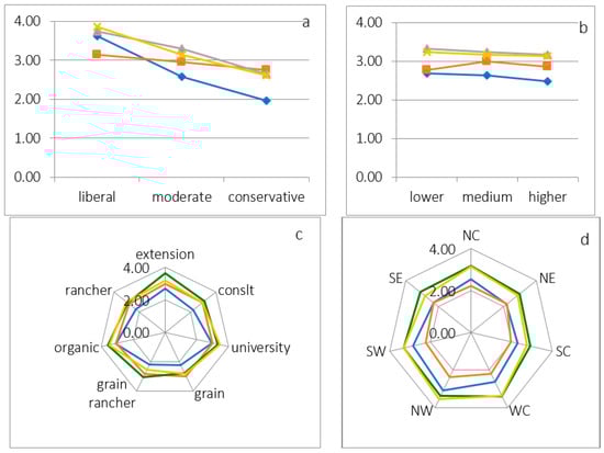 Comparisons of stakeholder perceptions toward climate change according to three demographic variables are presented in Figure 1, including political views (ranging from liberal to conservative; Figure 1a), production region (Figure 1b), and agricultural group (Figure 1c). The polygons’ vertices of the radar graphs in Figure 1 correspond to response mean-values. These graphs allow a quick estimation of differences in perceptions between demographic categories; for example, the more irregular the polygon, the higher the variation of the mean values among the demographic categories.