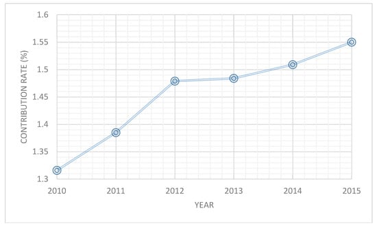 The factor contribution rate can help to explore the contribution trend of the government subsidy. According to Equation (3), with a sample of 18 assembling NEV enterprises, the contribution rate of government subsidy to growth rate of total income was calculated. In Figure 1, the contribution rate of government subsidies rose rapidly from 2010 to 2012 but rose stably from 2012 to 2015. As to the amount, the contribution rate was 1.316% in 2010, but reached to 1.55% in 2015. The results indicate that with the expansion of government subsidies, more government subsidies went into total income. While the subsidies promoted the R&D intensity in NEV enterprises, these government subsidies are also contributing to total income of NEV enterprises partly.