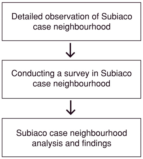 Using the mixed-method approach allows for cross-evaluation of observation and perception analysis within a neighbourhood case study [65,66,67]. This is utilised, among others, in architecture [42], urban design [52,69] and behavioural studies [66]. A case study is a well-defined unit of analysis which requires a detailed, in-depth depiction to generate new knowledge in complex social investigations which is very different from a numerical or statistical description of multiple items, places, events or phenomena. The choice of the case study is based on the researchers’ interests and its ability to provide a basis for analytical development and conceptual generalisation [67]. After the residential neighbourhood in Subiaco was selected for the purpose of creating a new front-yard typology, the actual research steps taken followed those presented in Figure 2.