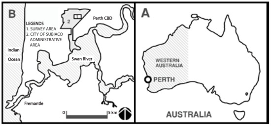 Maps of: Australia (A); and Subiaco (B) (Source: Authors).