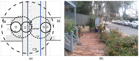 In a neighbourhood scale, the interactions within the semi-private–public (front yard) and public (e.g., sidewalk, verge, street parking, street, etc.) spaces are crucial for this study and they fall within the C3 (social distance) and C4 (public distance) categories. Social distances (C3) allow comfortable interactions between friends, neighbours and co-workers. Public distance (C4) is just double the size of social distance (C3). If a front yard and sidewalk fall within the range of social distance (C3), then the physical condition is considered as highly communicative for encouraging community interactions. When a front yard and sidewalk are within public distance (C4), this is seen as a medium communicative physical condition. Any distance beyond C4 is considered as low communicative physical conditions and typically falls within the distance range of C5 (recognisable distance). Recognisable distance (C5) helps to determine the level of social interaction between front yards across the street. In this range, people cannot talk comfortably as their voices are lost or fade. It is also difficult to clearly understand the facial expressions or movements of the other persons across the street. However, people can still identify the gestures and postures of others from this distance. Hence, a passive communication prevails. This situation is good for natural surveillance [29] but not for normal conversation. Natural surveillance is encouraged in planning schemes in various parts of the world with the aim to reduce crime. This is one of the main principles of Crime Prevention Through Environmental Design (CPTED) [77].