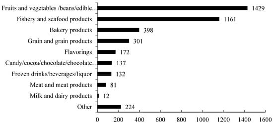 On the basis of the China food classification system (GB2760-2011), the food is divided into sixteen categories: milk and dairy products, oil/fat/fat products, frozen drinks, fruits and vegetables/beans/edible fungi/algae/nuts and seeds/candy/cocoa/chocolate/chocolate products, grain and grain products, bakery products, meat and meat products, fishery and seafood products, eggs and egg products, sweeteners(including honey), flavorings, special nutritional supplements, beverages, liquor, and other. According to statistical results of the sample and the approximation of food classification, we eventually adopted 11 categories, including three new ones (Figure 3). Among the new categories, we mix frozen drinks, beverages, liquor together, and mix candy/cocoa/chocolate/chocolate products, sweeteners (including honey) together, and mix oil/fat/fat products, special nutritional supplements and other together, and get rid of eggs and egg products (Special statement: FSIS (Food Safety and Inspection Service) and APHIS (Animal and Plant Health Inspection Service) of USDA (United States Department of Agriculture) are in charge of the meat and poultry, eggs and egg products supervision. Therefore, the classifications of Chinese export food refused in U.S. FDA do not include eggs and egg products.). After reclassification, we can see that the top four groups of Chinese refusal food involved fruits and vegetables (1429 cases (35.3%)), fishery and seafood products (1161 cases (28.7%)), bakery products (398 cases (9.8%)), and grain and grain products (301 cases (7.4%)). These four types of food form over 81 percent of all refusal cases. The further analyses and statistical results about the top four types of refusal food are shown in Table 2.